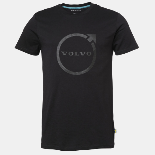 Black t-shirt featuring a subtle yet distinctive tone-on-tone Volvo Iron Mark print on the chest, a nod to the Volvo heritage with a modern twist. Crafted from GOTS-certified organic cotton, it promises comfort and durability while adhering to environmental standards. This tee is a unisex model with a straight fit. It is short-sleeved with a round collar and contrasting neck tape.